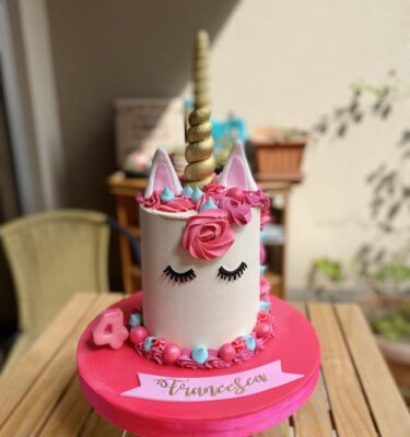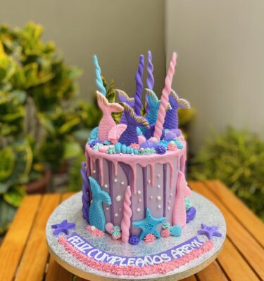 Nuestra torta temática de las guerreras K-Pop está bañada en buttercream glitter, logrando un acabado brillante y lleno de actitud. La decoración se complementa con toppers de cartulina que refuerzan el concepto y aportan un toque moderno y divertido.