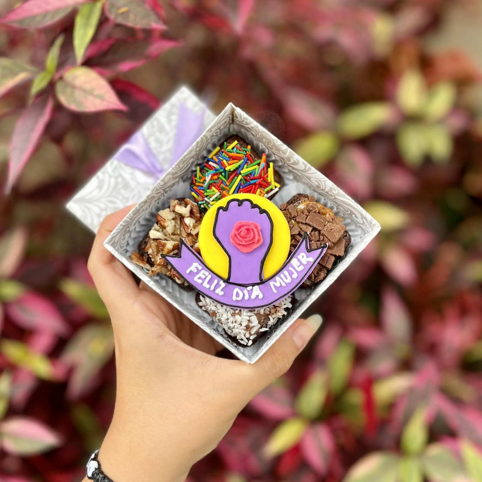 Nuestro Mini Four de Brownies por el Día de la Mujer es un detalle dulce y significativo para celebrar esta fecha especial. Incluye 4 deliciosos brownies, acompañados de una decoración central inspirada en el símbolo del puño levantado, junto a un pequeño banner con el mensaje “Feliz Día Mujer”.